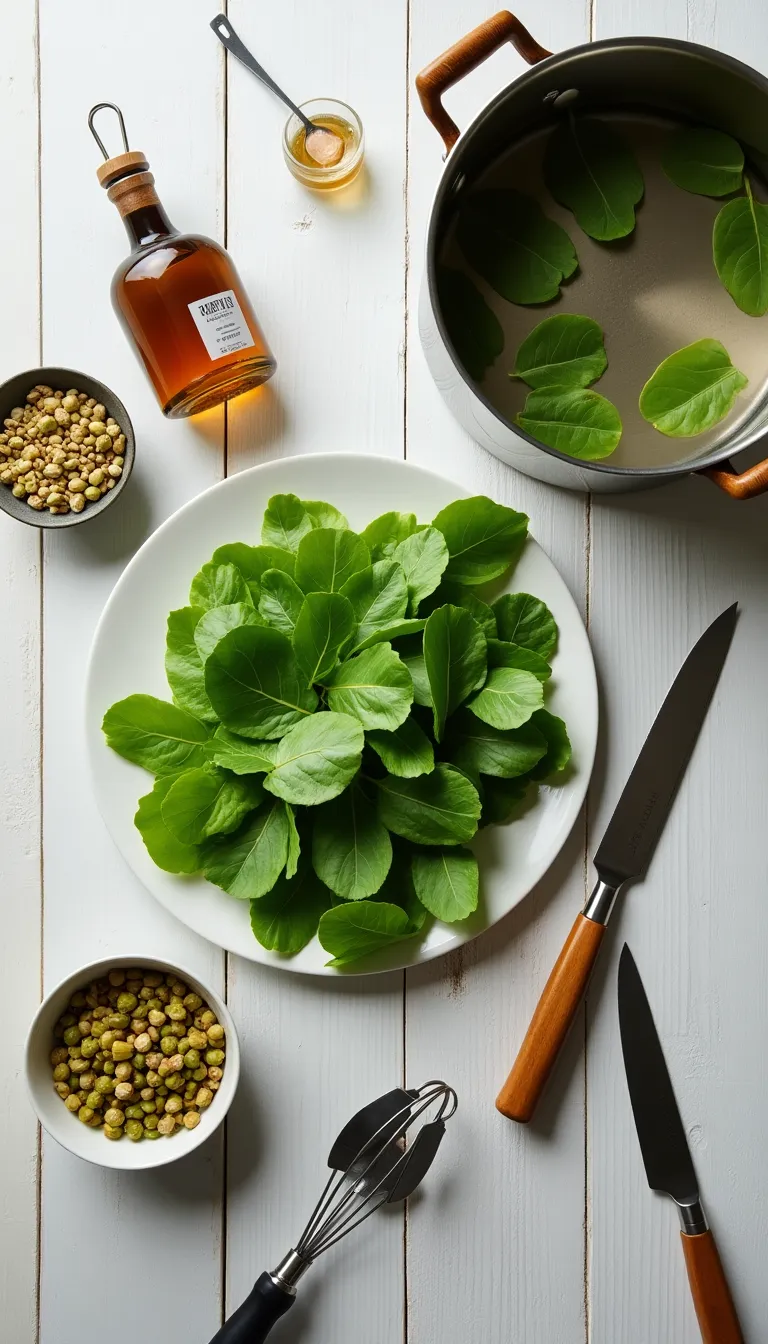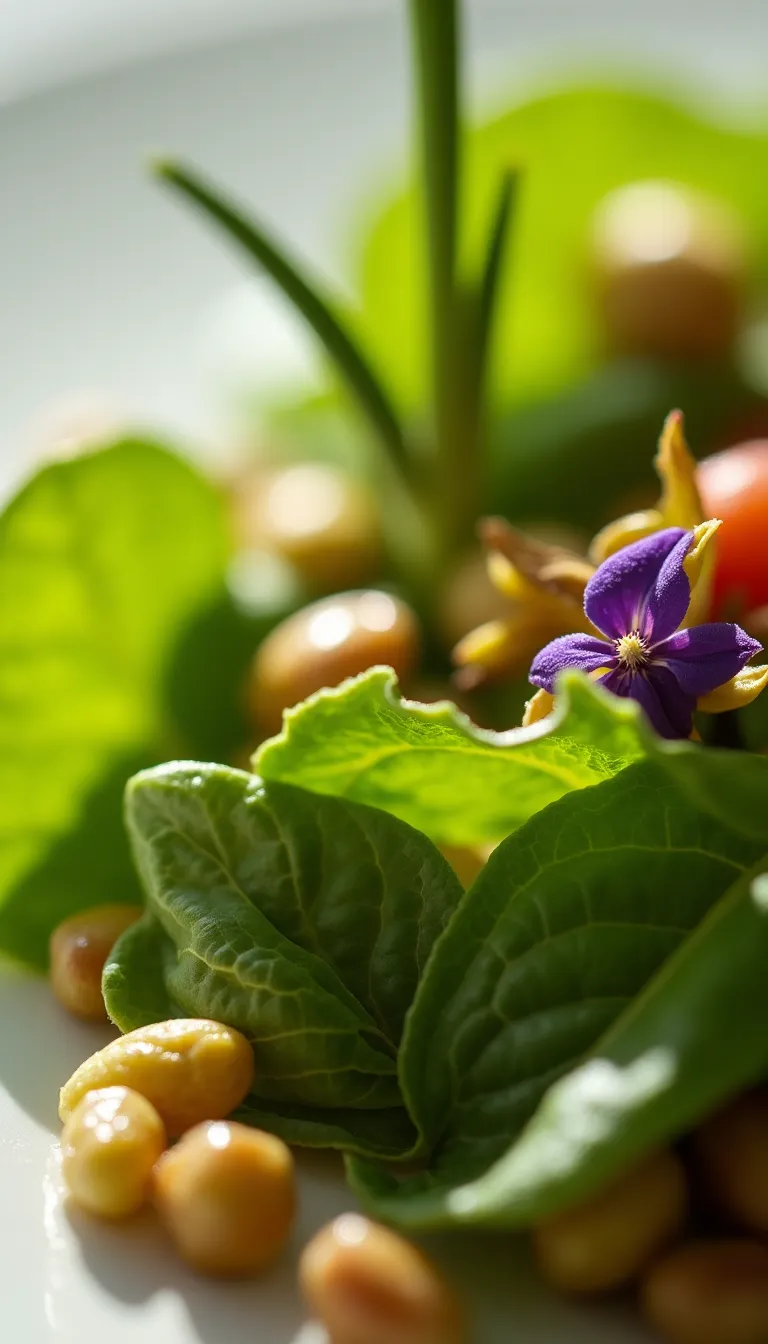 Si quieres que esta ensalada sea el centro de atención en la mesa, piensa en ella como una **obra de arte comestible**. Coloca las hojas de vid en capas tan armoniosas como las **escamas de un dragón verde**, espolvoreando los pistachos de tal manera que parezcan pequeñas esmeraldas brillando al sol. Los brotes de hinojo y las flores de romero no solo añaden color, sino que llenan de **vitalidad** el plato. Además, sirven como un guiño poético al aire libre, capturando la esencia del Mediterráneo en cada detalle.