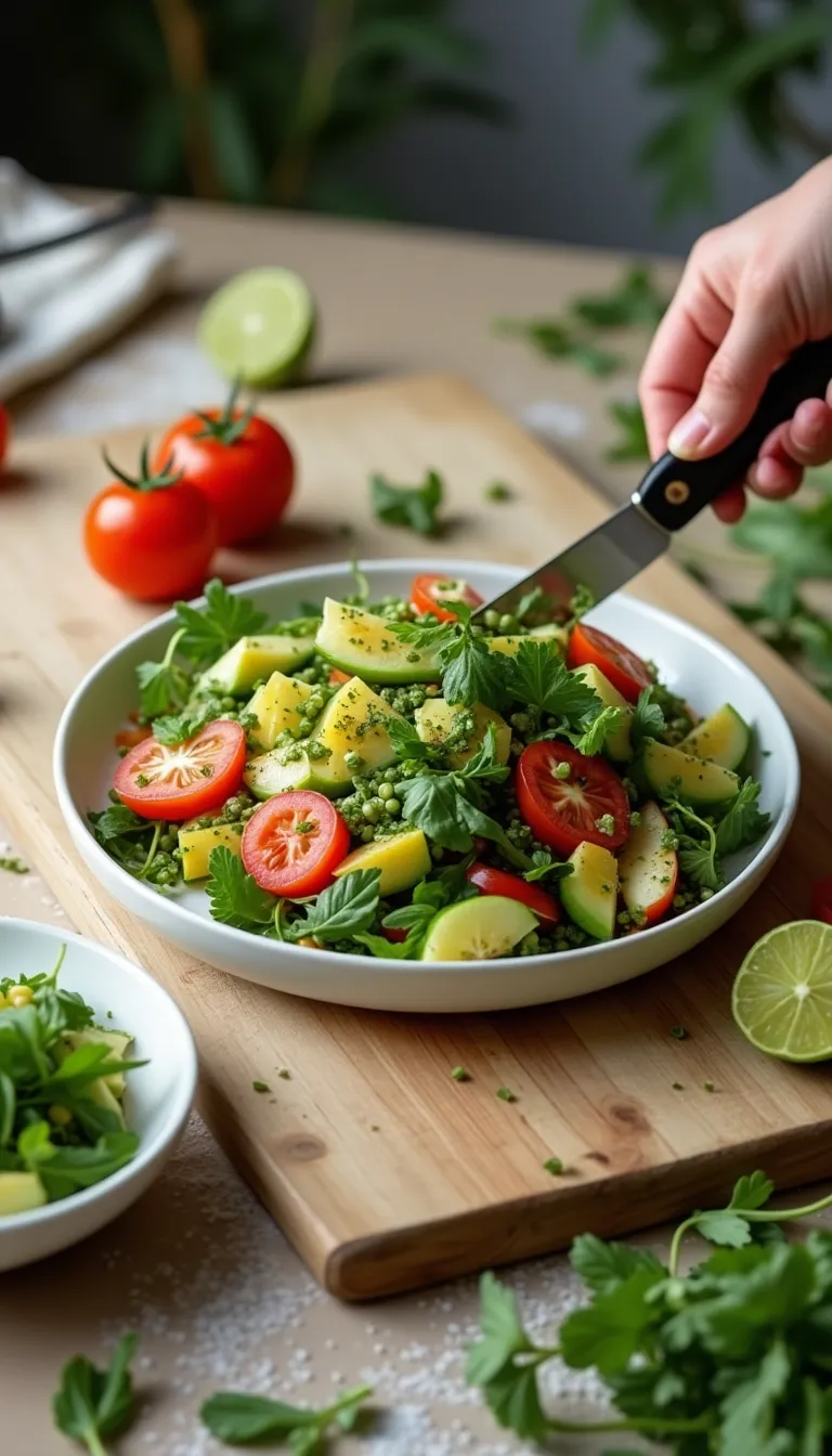 Ahora bien, ¿qué ofrece esta Ensalada Mediterránea con Hojas de Vid y Pistachos a tu arsenal culinario? Para empezar, es una receta que se alinea perfectamente con una filosofía **minimalista** en la cocina: pocos ingredientes pero mucha personalidad. Sin mencionar que es una opción fresca y ligera, ideal para disfrutar en cualquier época del año. Además, el uso de ingredientes de calidad como los pistachos de Bronte y el aceite de pistacho no solo eleva el plato, sino que también te permite experimentar con **sabores auténticos y distintivos**. Finalmente, la presentación simple pero elegante la hace perfecta para impresionar sin complicaciones.